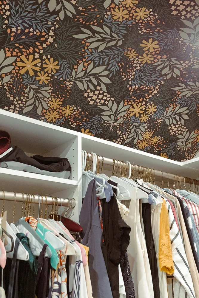 Partnering with The Tailored Closet of Central Pennsylvania, we reimagined the walk-in closet. Even though square footage was reduced, the new design provides far more storage and better organization. To bring some personality into the space, we layered in a deep olive carpet and a bold wallpaper on the ceiling—because even closets deserve a little fun.