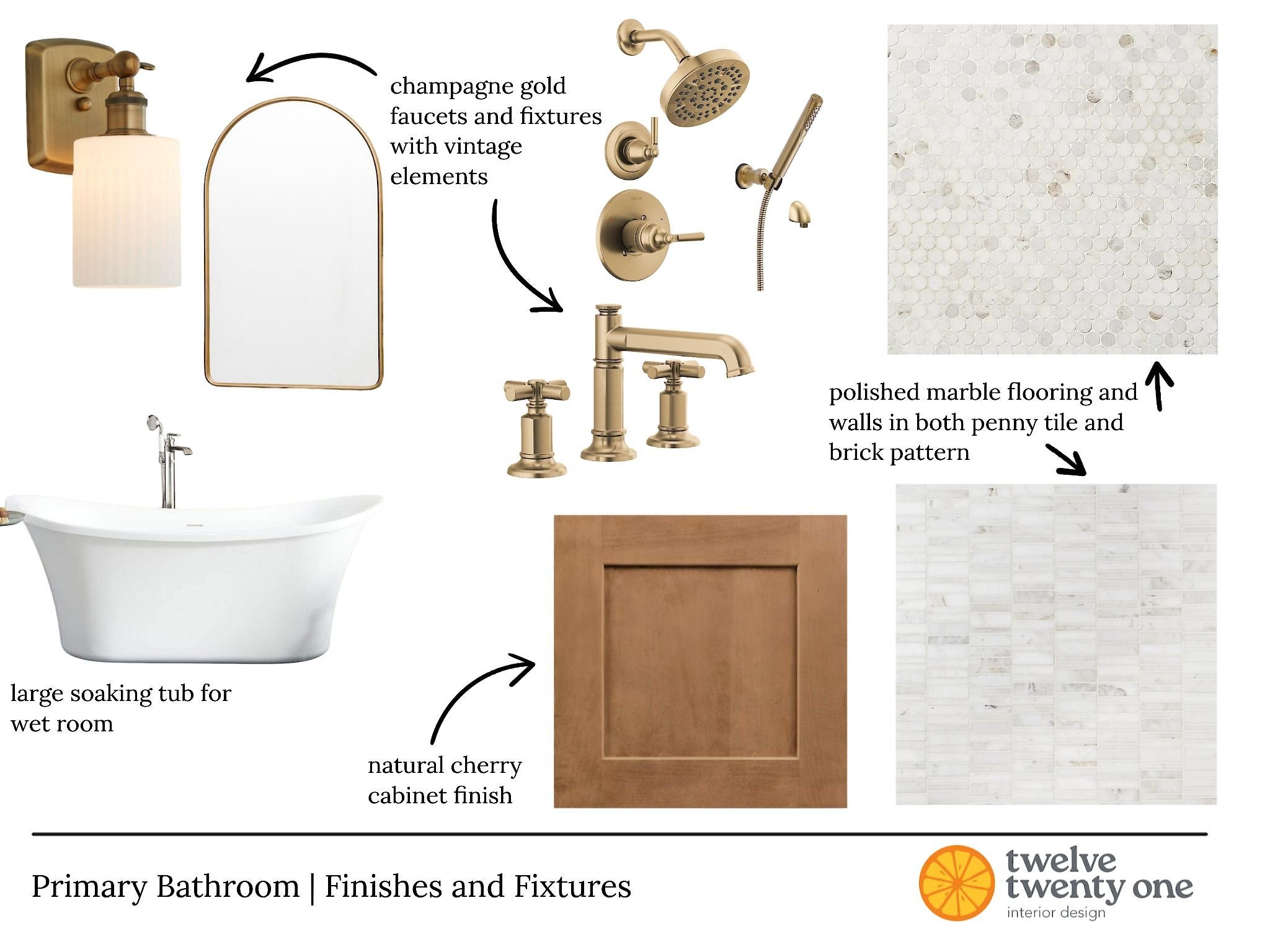 Tile: A natural marble in stacked rectangular shapes, giving a clean, contemporary edge to a timeless material. The same marble extends floor-to-ceiling in the wet room, while a penny tile version behind the vanity adds subtle texture.