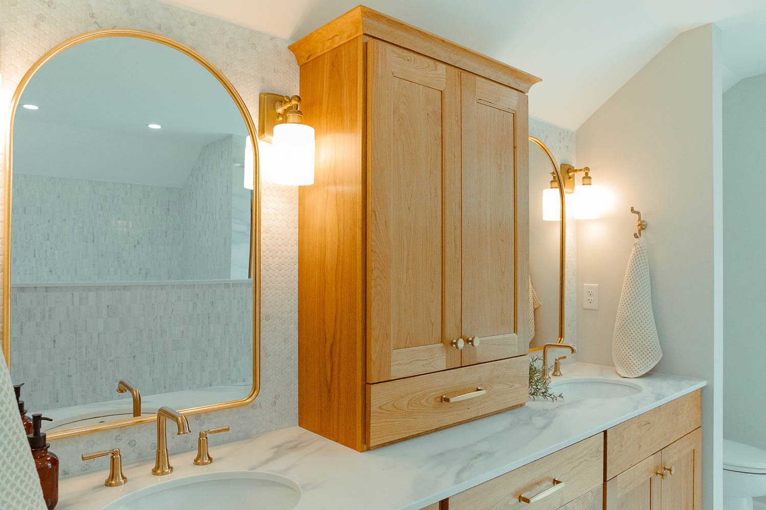 Cabinetry: Custom cherry cabinets by KLG Custom, in a light natural finish. Taller and deeper than the originals, the vanity and laundry cabinetry now provide generous storage while adding warmth to the neutral palette.